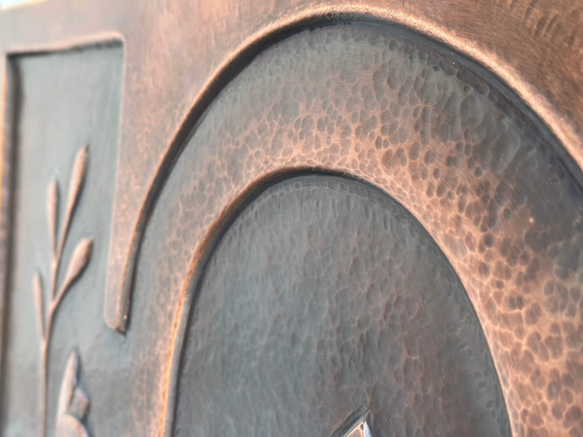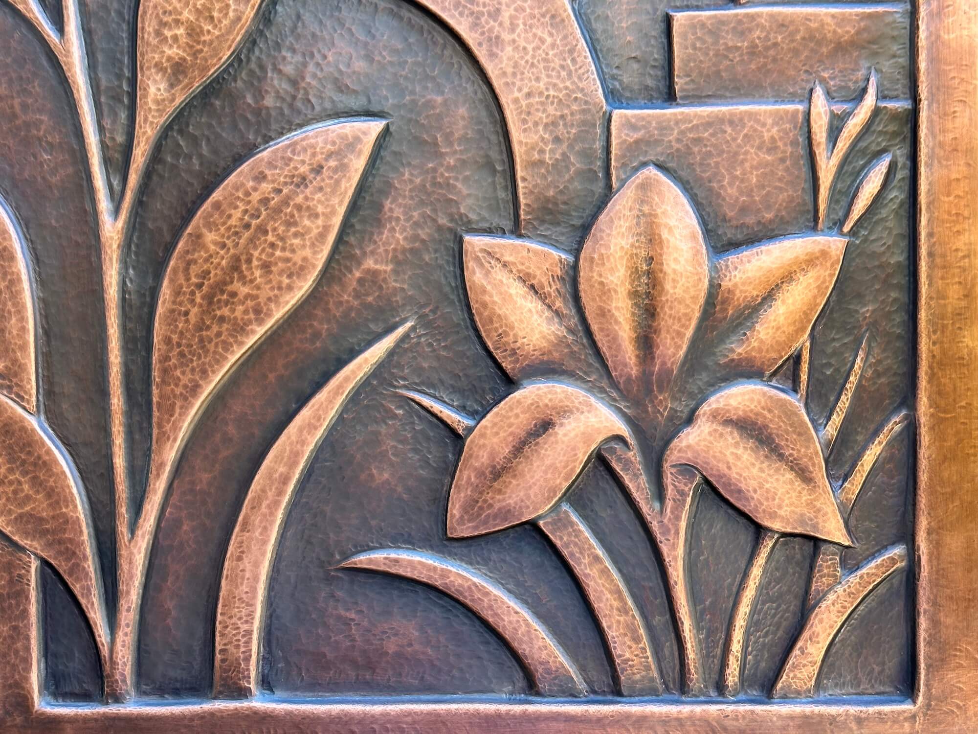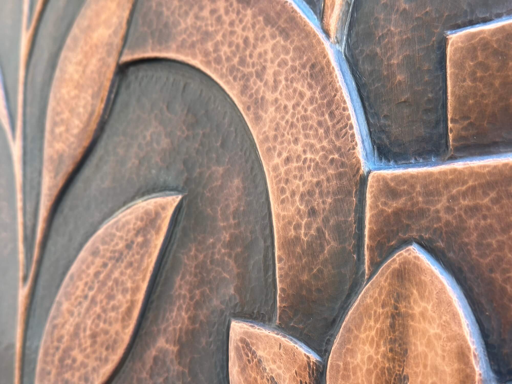 The relief was created gradually using handheld hammers, punches and pneumatic tools. The surface depth was forged by pushing the metal from both sides, rather than by adding or removing material, softening the copper with heat between each stage to maintain pliability. The resulting texture is a direct record of thousands of individual strikes, capturing the story its creation within the metal itself. The raised relief is about 1/4 inch deep.
