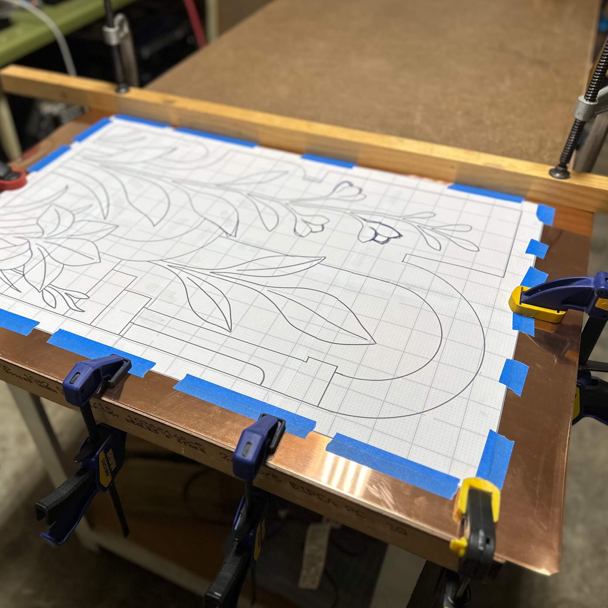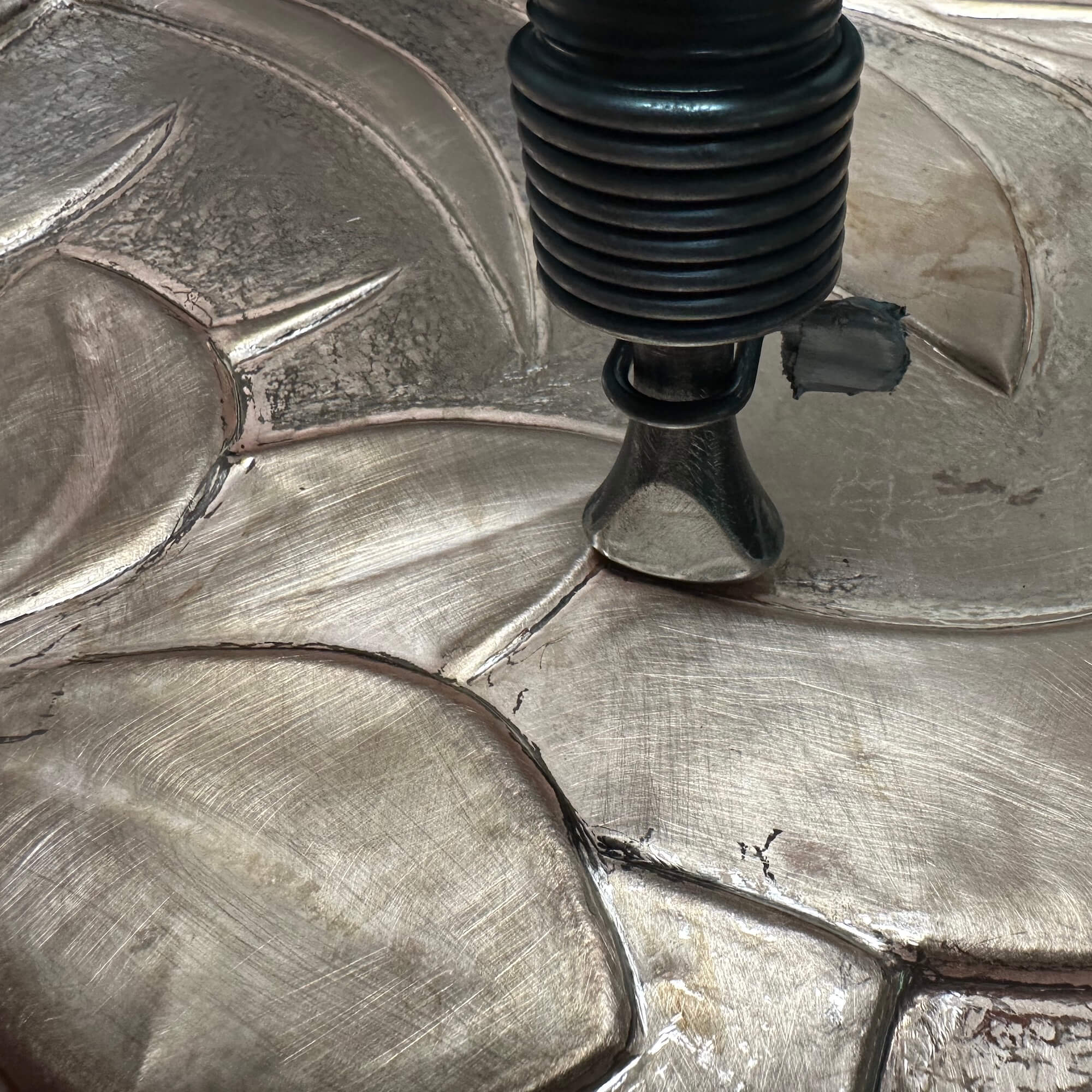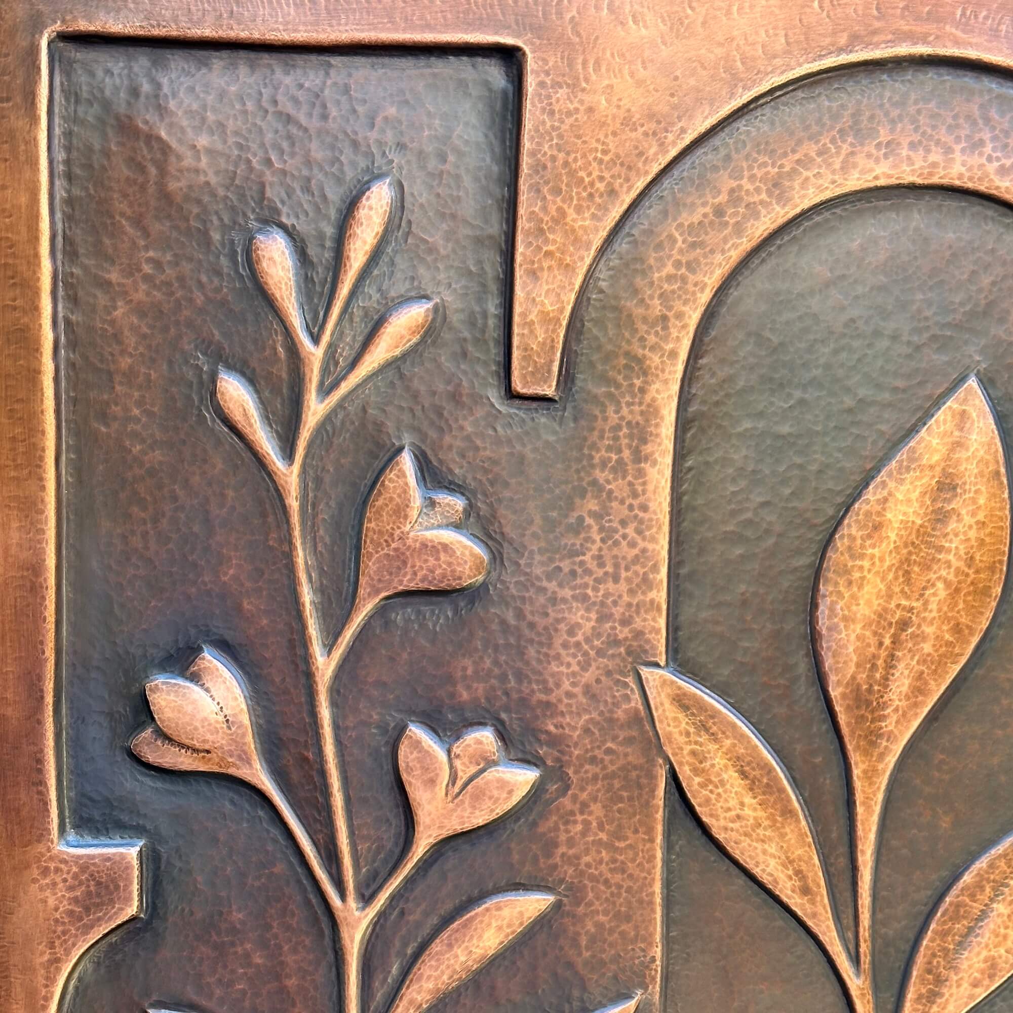 The relief was created gradually using handheld hammers, punches and pneumatic tools. The surface depth was forged by pushing the metal from both sides, rather than by adding or removing material, softening the copper with heat between each stage to maintain pliability. The resulting texture is a direct record of thousands of individual strikes, capturing the story its creation within the metal itself. The raised relief is about 1/4 inch deep.