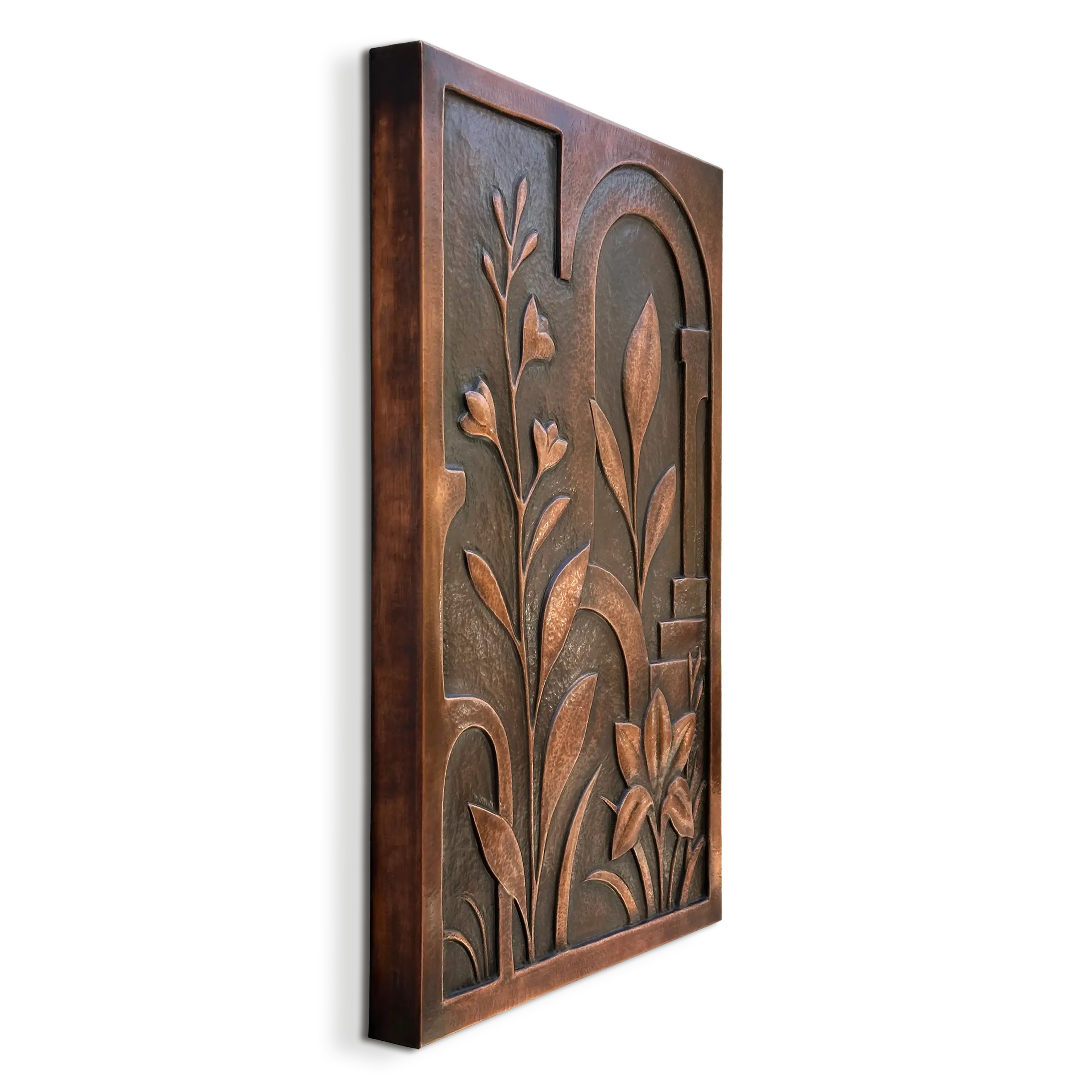 Organic, botanical forms merge with layered architectural shapes in this one-of-a-kind metal wall sculpture. Hand-formed from a single sheet of copper, the raised relief was pushed directly into the metal, leaving a surface patterned with the impressions of the forming process. This original design blends classical motifs with a contemporary composition, giving it a versatile style that matches a range of decor. Only one has been made. There are no duplicates or molds for mass-production.