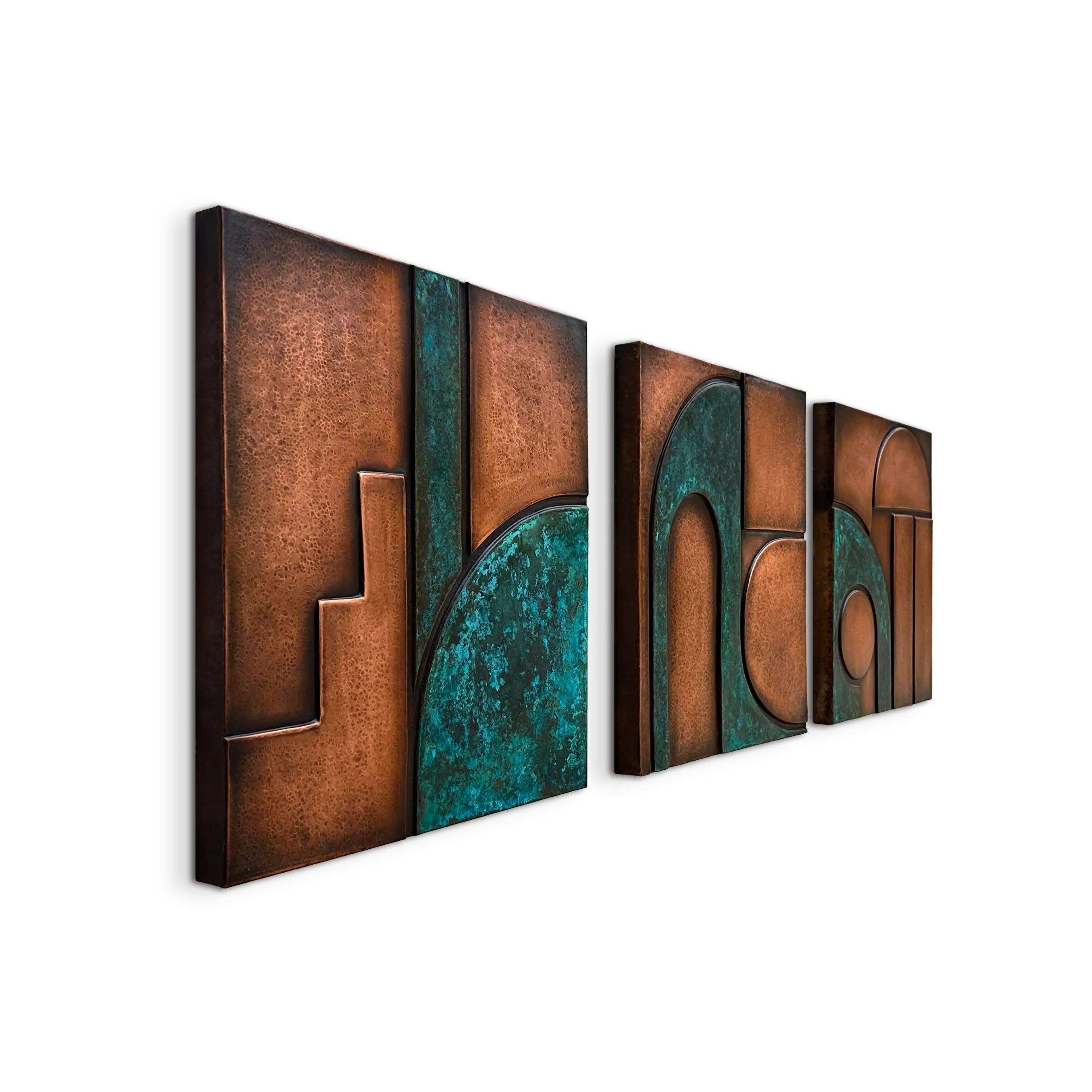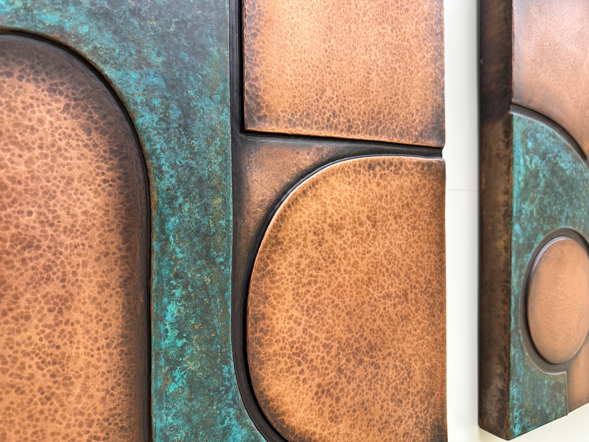 This three-panel copper wall sculpture has a modern abstract design and is made from hand-shaped sheet metal. Measuring 1½ inches deep, these panels have three-dimensional surfaces of raised geometric planes and curved forms with a ¼-inch relief. The copper was treated with salts, acids and chemicals over several weeks to produce a colorful patina of browns, blacks, and blue-green tones.