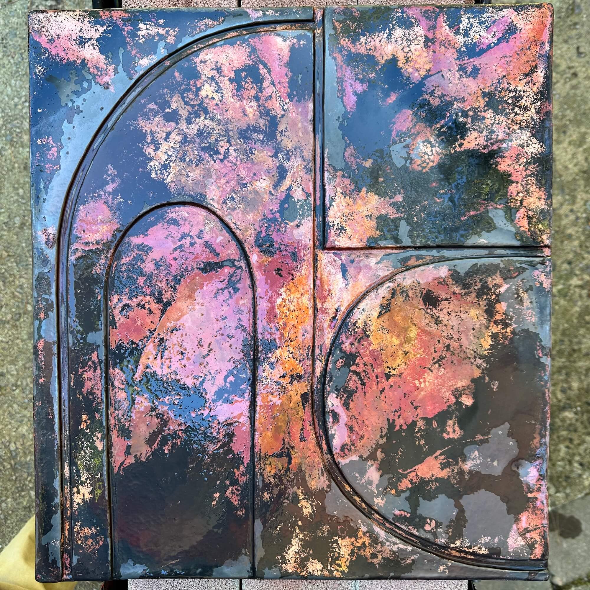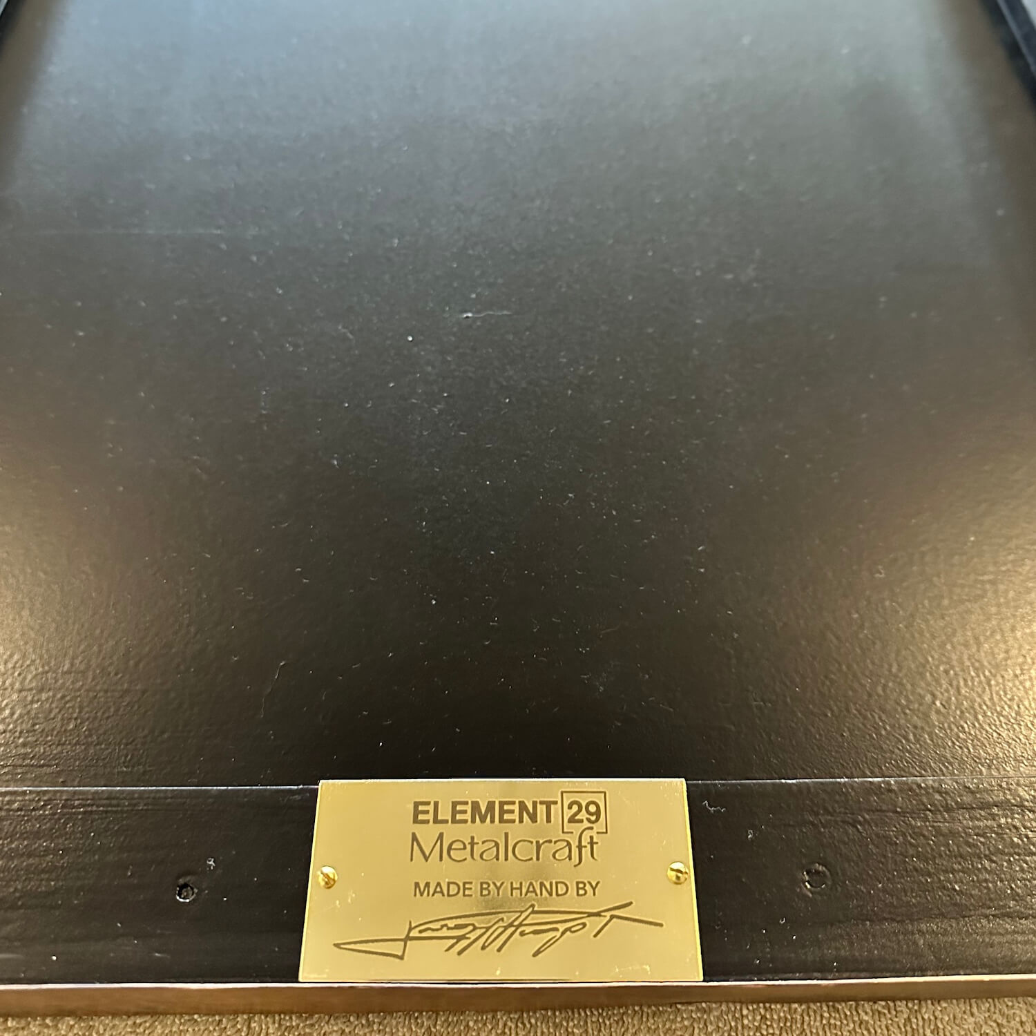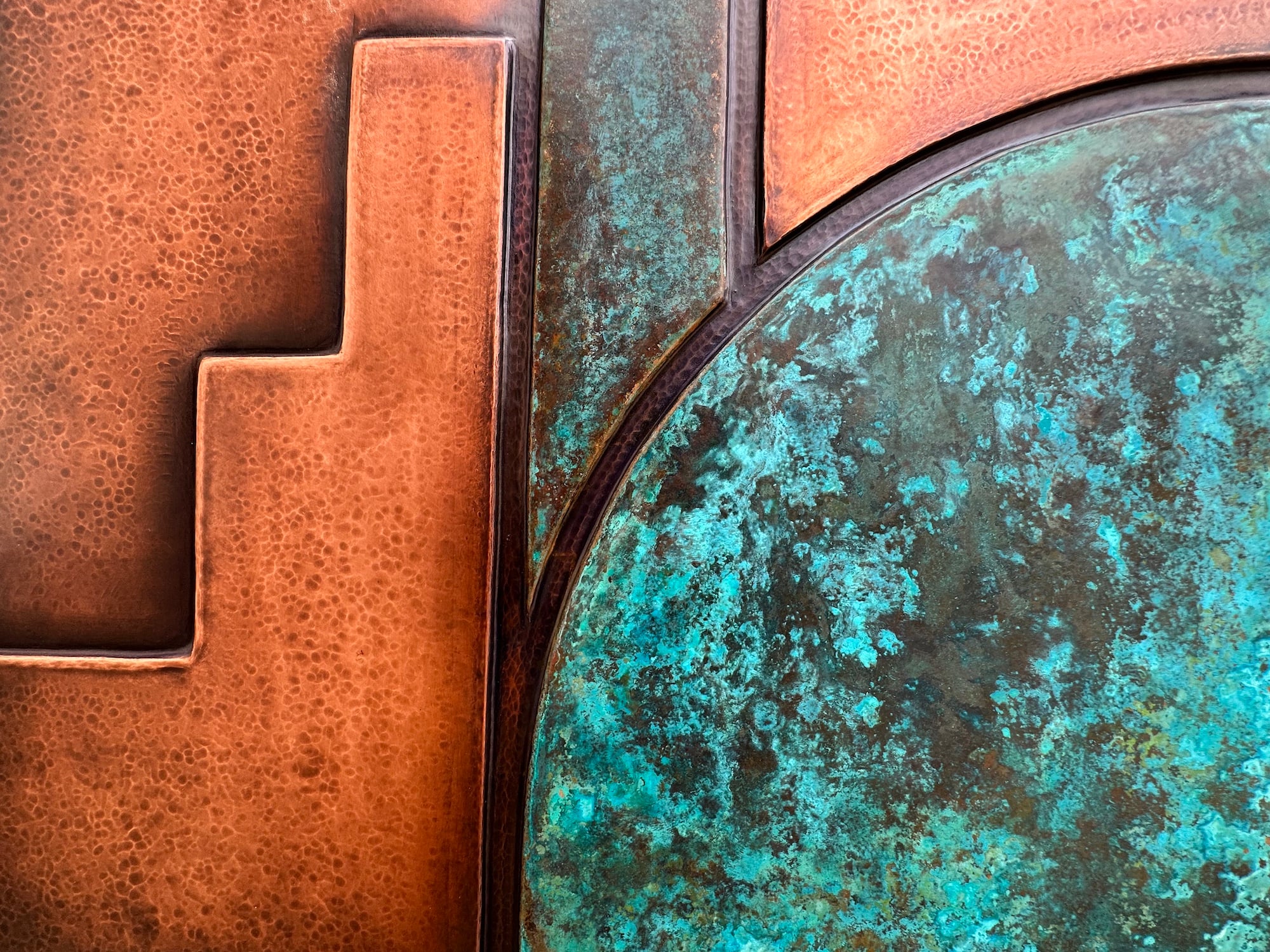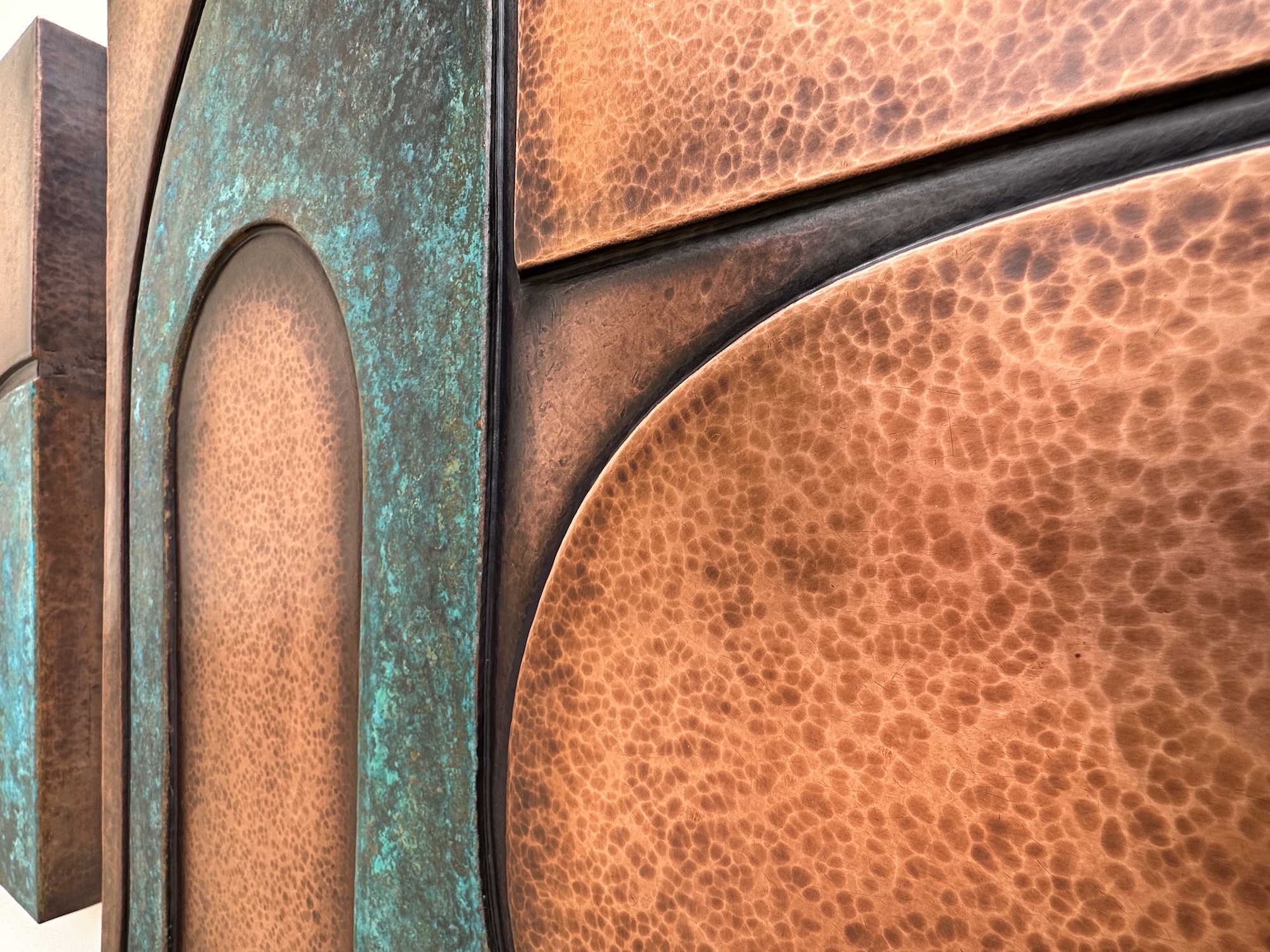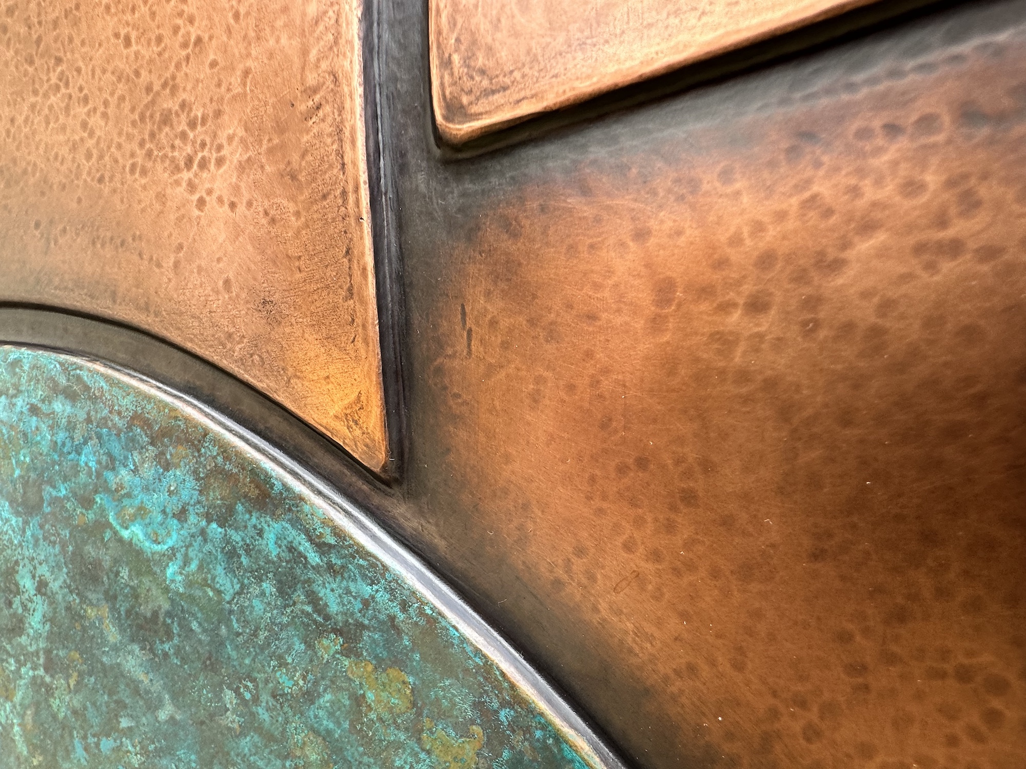 The panels were formed from flat copper sheet metal using hammers and pneumatic tools to create a three dimensional surface. There is about a 1/4 inch of depth in the raised relief, which was driven directly into the metal by thousands of hammer blows, rather than created by adding or removing material. These hammer marks are visible across the metal, creating a rich surface texture and a record of the forming process.
